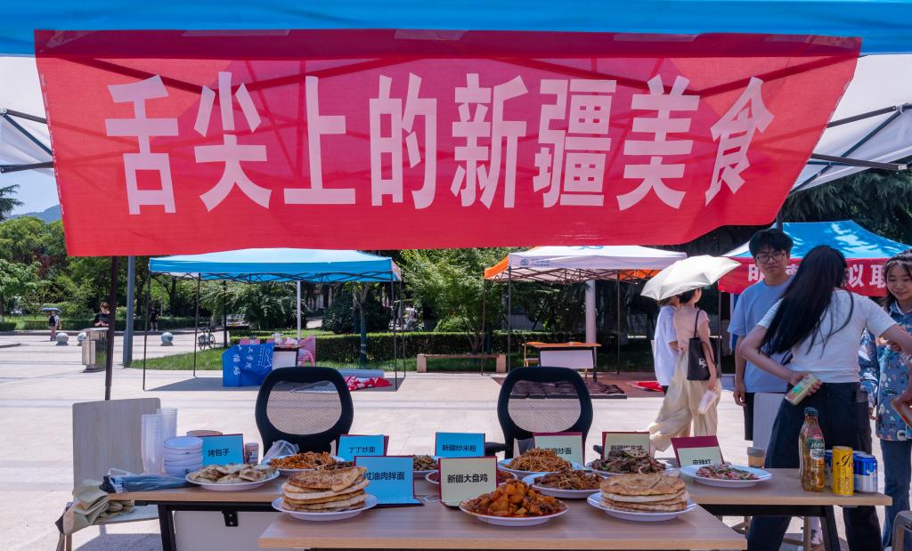 6月10日,“舌尖上的新疆美食”品鉴会在学校中心广场举办,来自新疆的大盘鸡、椒麻鸡、米粉、烤包子、丁丁炒面、干煸炒面、皮辣红等特色美食琳琅满目,令人垂涎欲滴,迅速吸引大批学生前来围观品尝,现场气氛热烈。