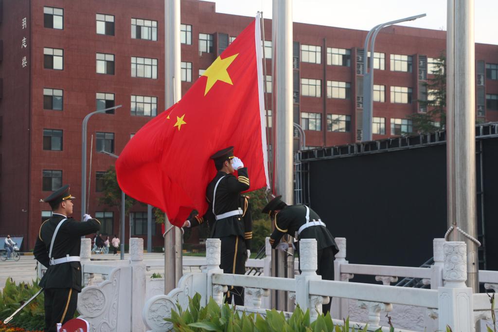 7时整,国旗护卫队迈着整齐标准的步伐护送鲜艳的五星红旗,伴随着嘹亮的《义勇军进行曲》,五星红旗在朝阳中冉冉升起。大家庄严肃穆,向国旗行注目礼,表达对伟大祖国的热爱之情。