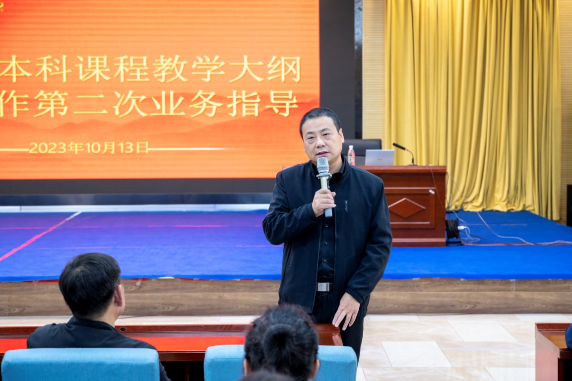 紧接着,教务处副处长文亮对前一阶段大纲修订工作进展情况进行了介绍,重点阐述了本次业务指导前收集部分课程大纲初稿及制定过程中的问题情况,并再次强调了课程大纲的时间节点和安排。