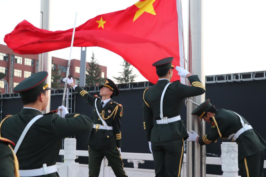 清晨,明德校园,清新怡人。7时整,国旗护卫队迈着铿锵有力的步伐护送着国旗走向升旗台,伴随着高亢激昂的《义勇军进行曲》,鲜艳的五星红旗在晨风中冉冉升起,师生们手持小红旗整齐列队高唱国歌,向国旗行礼,表达自己的爱国之心和喜悦之情。