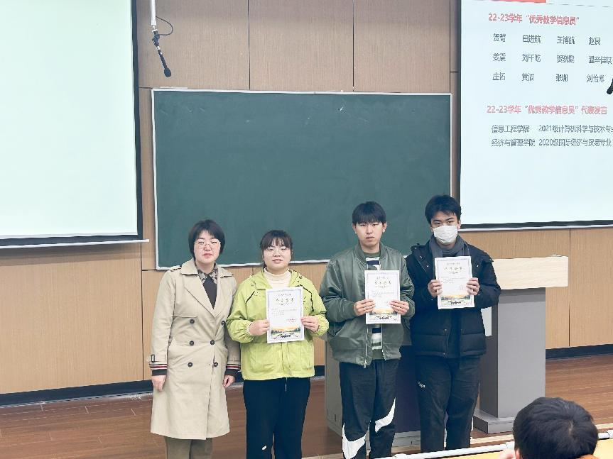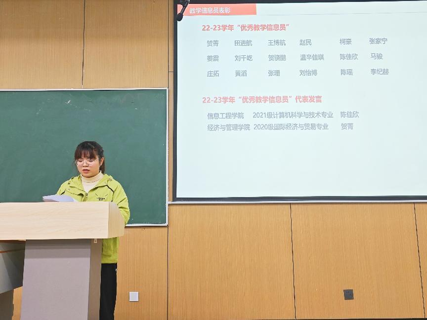 随后,质量管理与评估办公室老师为18位优秀教学信息员颁发了证书及奖品,陈佳欣、贺菁两位优秀教学信息员代表分享了教学信息员工作心得体会。陈佳欣提到作为教学信息员,应细心观察、广泛收集、准确传达、高效沟通;贺菁提到教学信息反馈工作是连接学校与学生之间的纽带,应充分发挥主观能动性,客观、如实地将同学们在学校教学管理、教学环节、教师、班风学风等方面存在的问题进行反映。两位优秀教学信息员的发言让新聘教学信息员对信息员工作有了基本认识,激发了信息员们工作的责任意识。