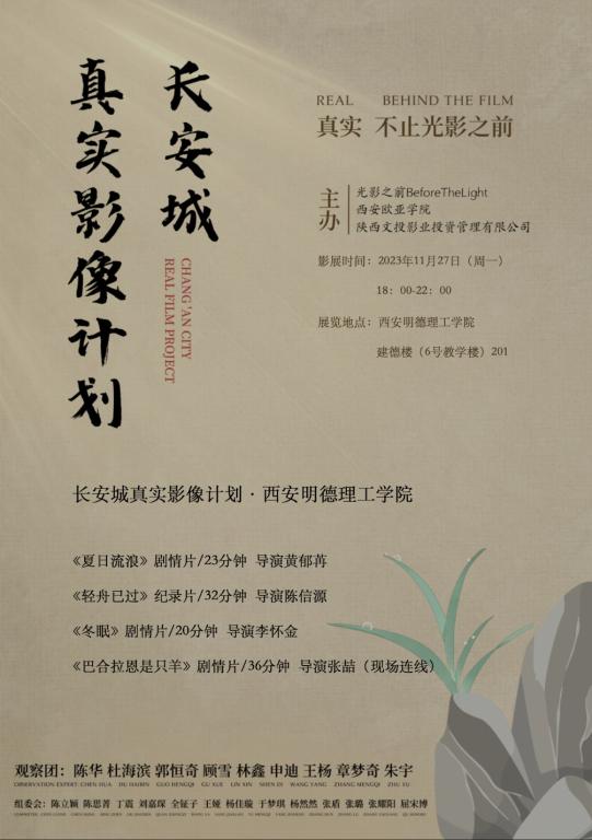 为提高艺术与设计学院2023级新生影视鉴析和制作水平,更好地培养未来影视制作类应用型人才,发展应用型课堂效力。11月27日晚,艺术与设计学院在建德楼201报告厅成功举办“2023长安城真实影像计划 2026年国际足联世界杯展映活动”,艺术与设计学院影视摄影与制作专业、数字媒体艺术专业大一新生,教师代表贾晓兰、黄德缘、杨宇堃、兰艳参与此次活动,活动由杨宇堃老师主持。此次展映共遴选出其中4部影片,展映影片为《夏日流浪》《轻舟已过》《冬眠》《巴合拉恩是只羊》。