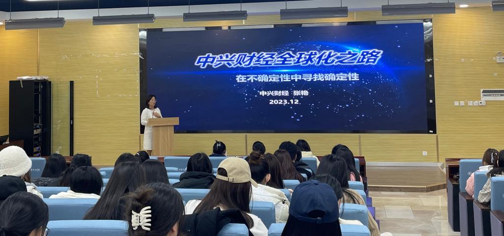 为进一步营造良好的育人环境和学习氛围,打造“学在明德”品牌建设,开拓学生的知识视野,让学生了解专业、行业发展现状和前景。经济与管理学院于12月7日下午在建德楼202举办学术科技月系列讲座第二讲。邀请中兴通讯股份有限公司集团财务共享中心核算总监张艳做题为“中兴财经全球化之路--在不确定性中寻找确定性”的专题讲座。中兴通讯股份有限公司人事部苗佩佩,学院2021级会计学、财务管理专业学生参加了讲座。讲座由辅导员白丽萍主持。