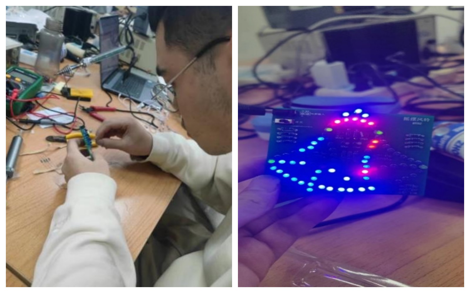 在三个月的学习和实践过程中,学生们亲手设计、制作了一系列电子产品,并于2024年1月4日在科创实验室举办了成果展,信息工程学院执行院长翟书颖、党委书记肖千春、北斗应用技术学院副院长张健、教务处李思璋及学院教师莅临指导,学生们详细介绍并展示了自己的作品。