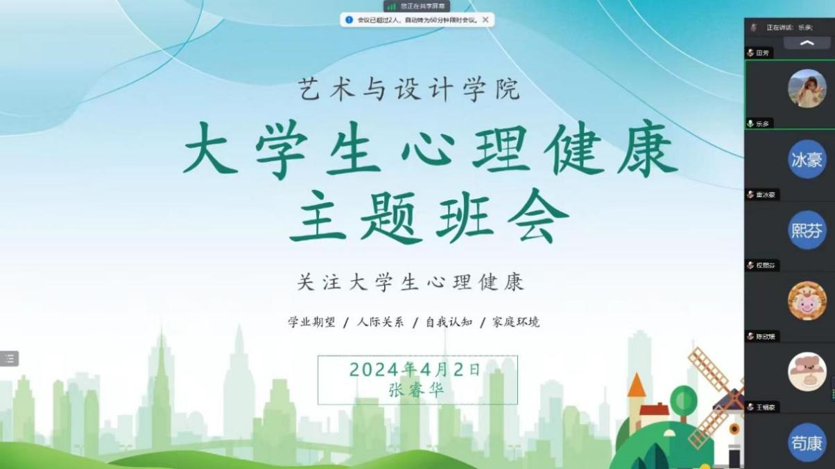 为积极响应并落实陕西省委教育工委《关于开展第九届陕西高校“阳光护航”心理育人宣传季实践活动的通知》文件精神,进一步优化学校心理育人工作,提升学生积极心理品质,促进大学生心理健康成长,宣传普及心理健康知识,引导学生保持乐观、自信的阳光心态,营造积极向上、和谐融洽的班级氛围。艺术与设计学院各年级于2024年4月1日至3日相继召开心理健康主题班会。