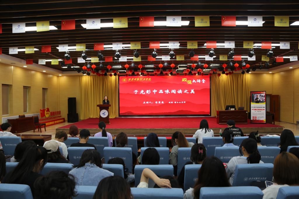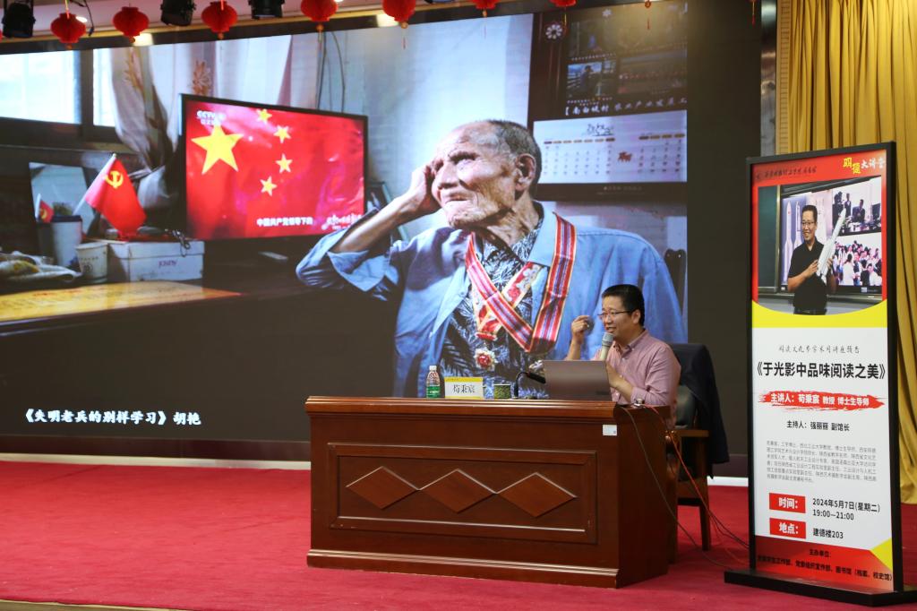 为全面推进大学文化建设,构建大学校风、教风、学风内涵体系,在第29个世界读书日来临之际,图书馆联合校党委组织宣传部、党委学生工作部、校工会、校团委开展“学在明德・书香满园”阅读文化节活动。5月7日晚,2024年阅读文化节系列活动之“学术月讲座”如期而至,400余名师生在建德楼203报告厅齐聚一堂,于光影中品味阅读之美。本次讲座由图书馆副馆长强丽丽主持。
