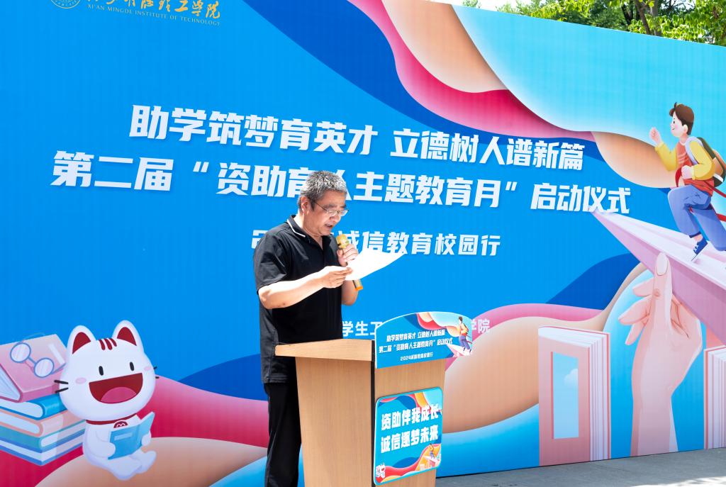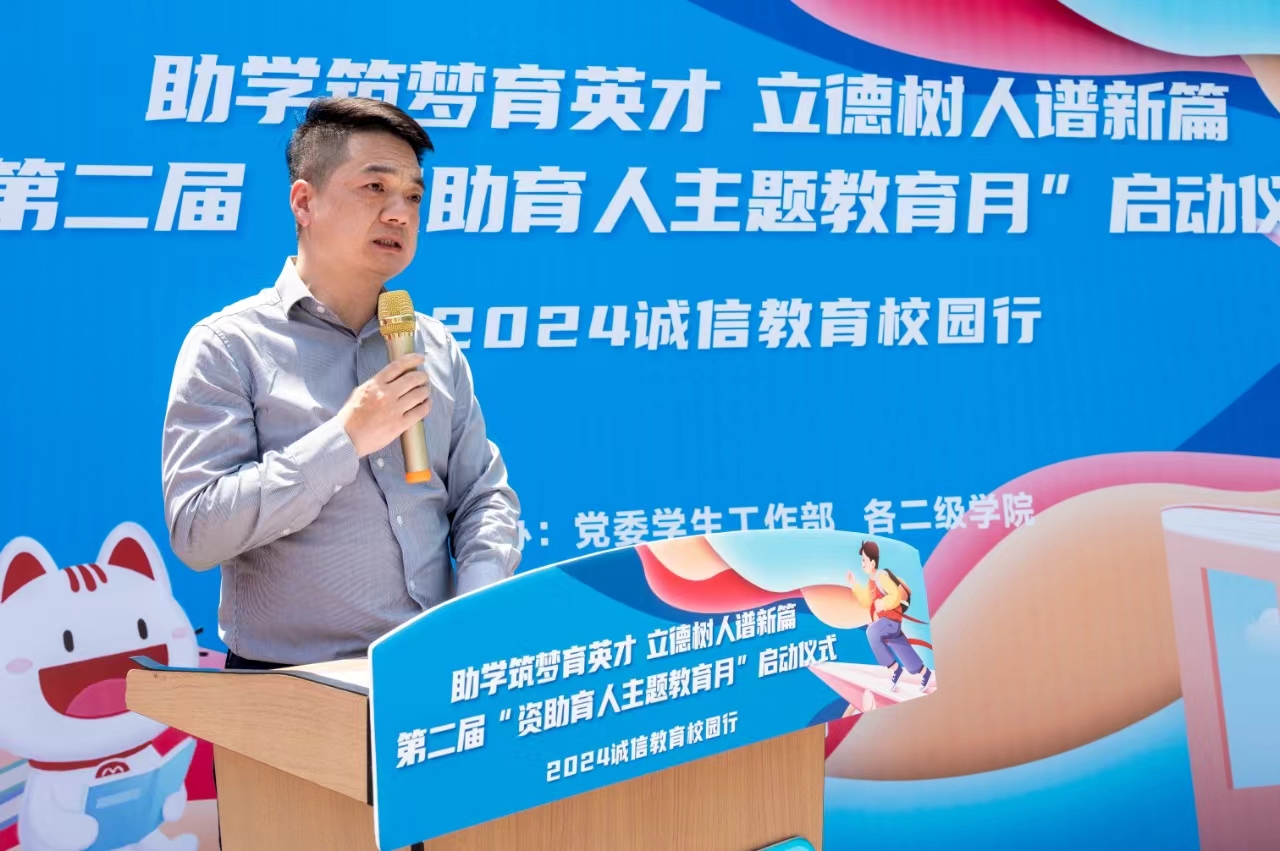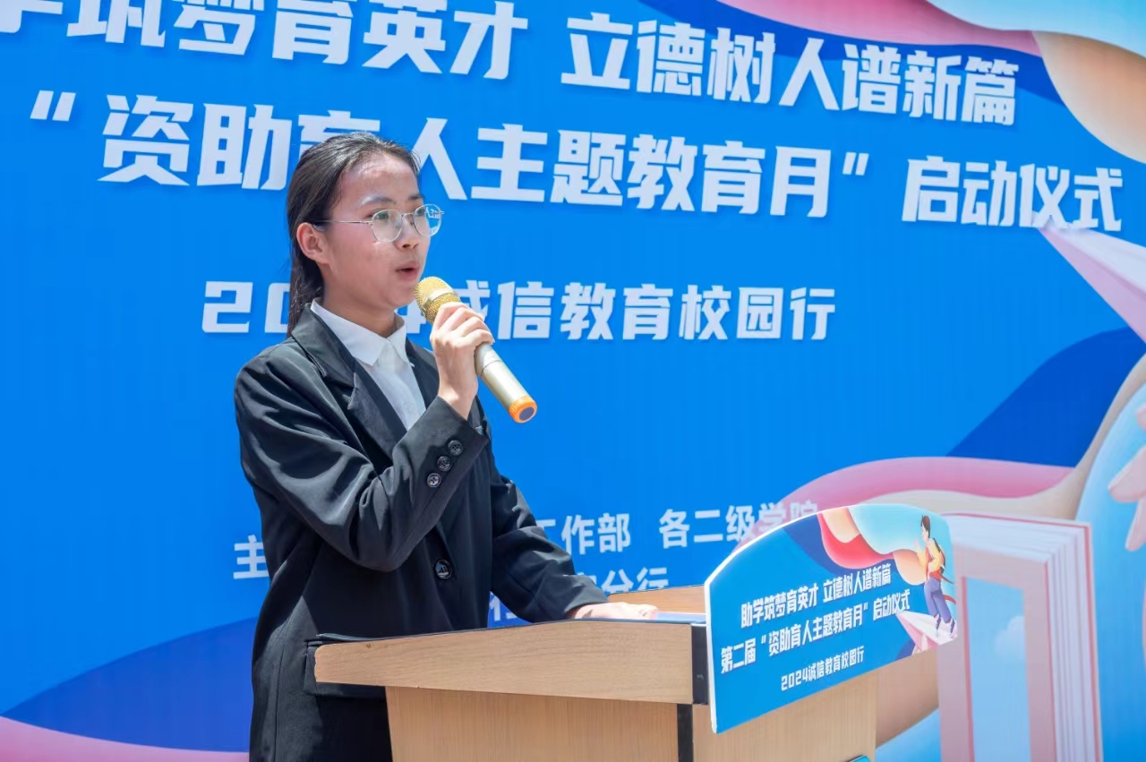 仪式最后,童杨梓宣布“第二届资助育人主题教育月”启动。他讲到学校建立了“奖、助、勤、贷、补、减、免”七位一体的学生资助政策,学校通过各类资助育人活动将感恩教育和资助帮扶有效结合,有助于培育学生自强自立、诚实守信、知恩感恩和回报社会等优秀品质,促进学生成长成才,鼓励同学们在新时代担当起新青年的责任。