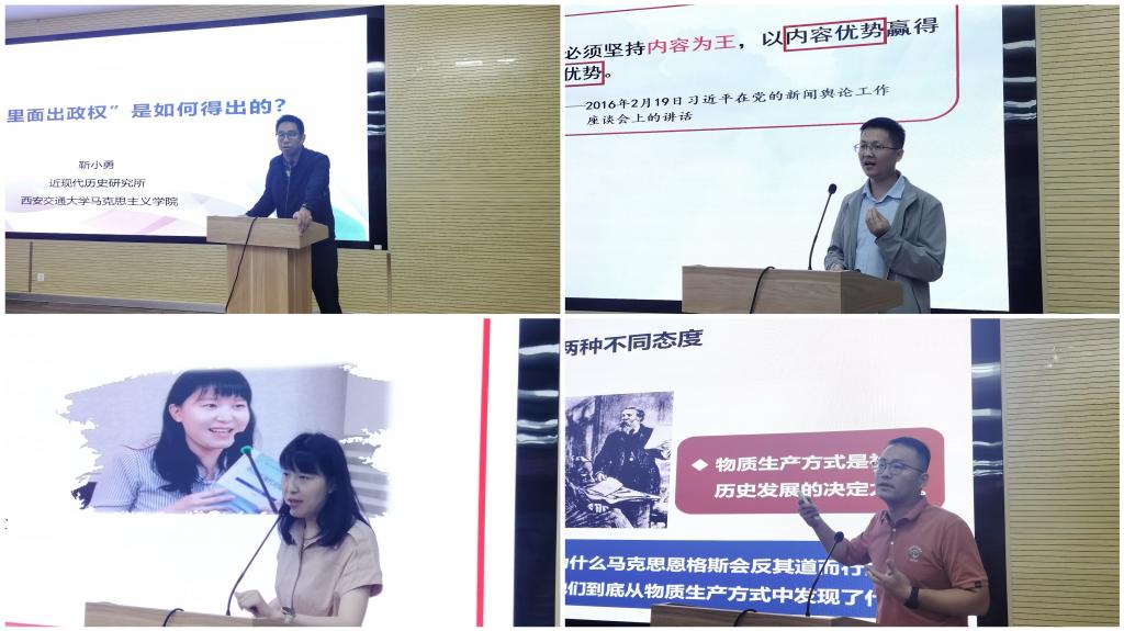 下午,试讲点评环节中,马克思主义学院周蓓蓓、吴梦茜、张乐、胡景莲、党淑敏、王晓强等六位教师分别围绕“全过程人民民主,托起人民‘稳稳的幸福’”“建党精神的特质与内涵”“从物质与意识的辩证关系看人工智能”“在‘自找苦吃’中涵养新时代青年的精气神”“用实事求是之光,照亮勇毅前行之路”“牢牢把握新时代民族工作之‘纲’”等主题进行了试讲。试讲教师们在同台竞技中相互学习、取长补短,提高了教学竞赛的能力和水平。