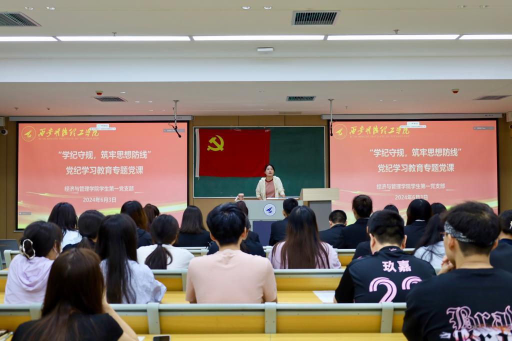 为推进党纪学习教育走深走实,6月3日晚,经济与管理学院学生第一党支部在7号教学楼801开展党纪学习教育专题党课,支部全体党员、发展对象及入党积极分子代表参加了学习。