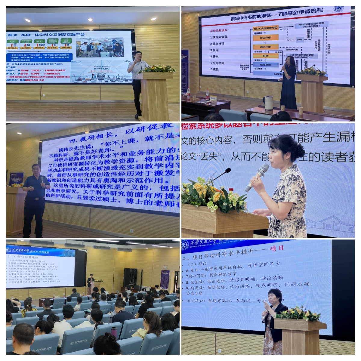 培训班以专家讲座和工作坊两种形式组织展开,其中讲座共5场,工作坊1场。西安交通大学袁晓玲教授以《发挥优势 注重积累 提升科研项目申报质量》为题开篇,详细讲解了科研积累的途径、项目申报前的准备及标书的撰写,带领教师走进科研申报之门;西安建筑科技大学史丽晨教授以《学术论文写作与投稿经验分享》为题,从论文选题、论文撰写、论文投稿、论文翻译、常用工具等五个方面详细讲解如何写出一篇高质量的学术论文;西安建筑科技大学宫春梅教授以《科研项目申报体会》为题,从了解基金申请流程、基金指南、基金的特点和偏好开始,围绕基金申报的主要内容逐一展开申报书的填写规范和获奖作品示范;西安交通大学陈立斌教授以《科教融合:产教融合协同创新、产教融合的探索与实践》为题,以交大“菁英班”为例,从创新实践平台、人才培养模式、构建产业学院、产学合作协同育人等多个方面分享了产教融合的探索和丰硕成果;西安电子科技大学刘三阳教授以《科教融合,教研相长 ——试谈青年教师专业能力提升之道》为题,从高校教师的业务工作开始,指导教师如何去有效实践科教融合。他鼓励教师积极申请科研项目,教研相长,以研促教,从教学方法探索、备赛攻略、课程建设、炼就良师等多个方面为青年教师成长发展总结凝炼了许多宝贵的方法。