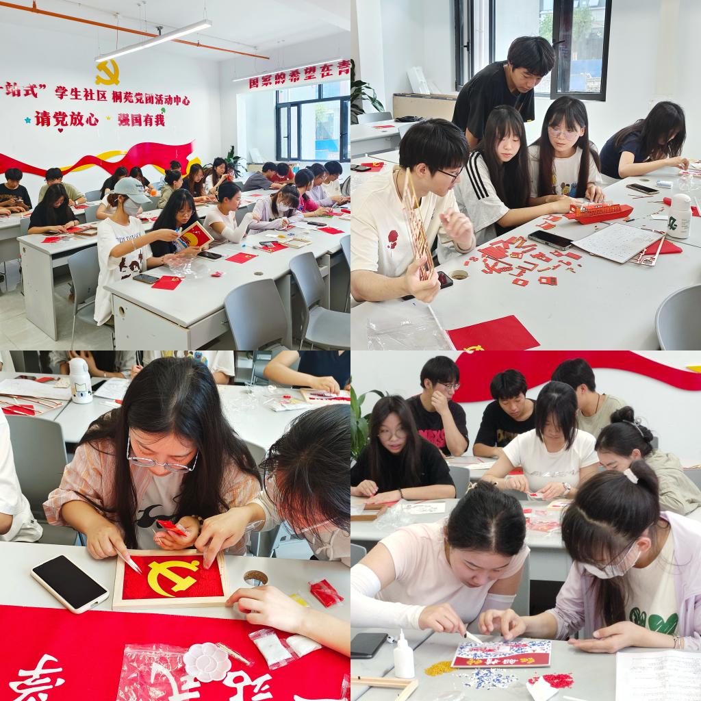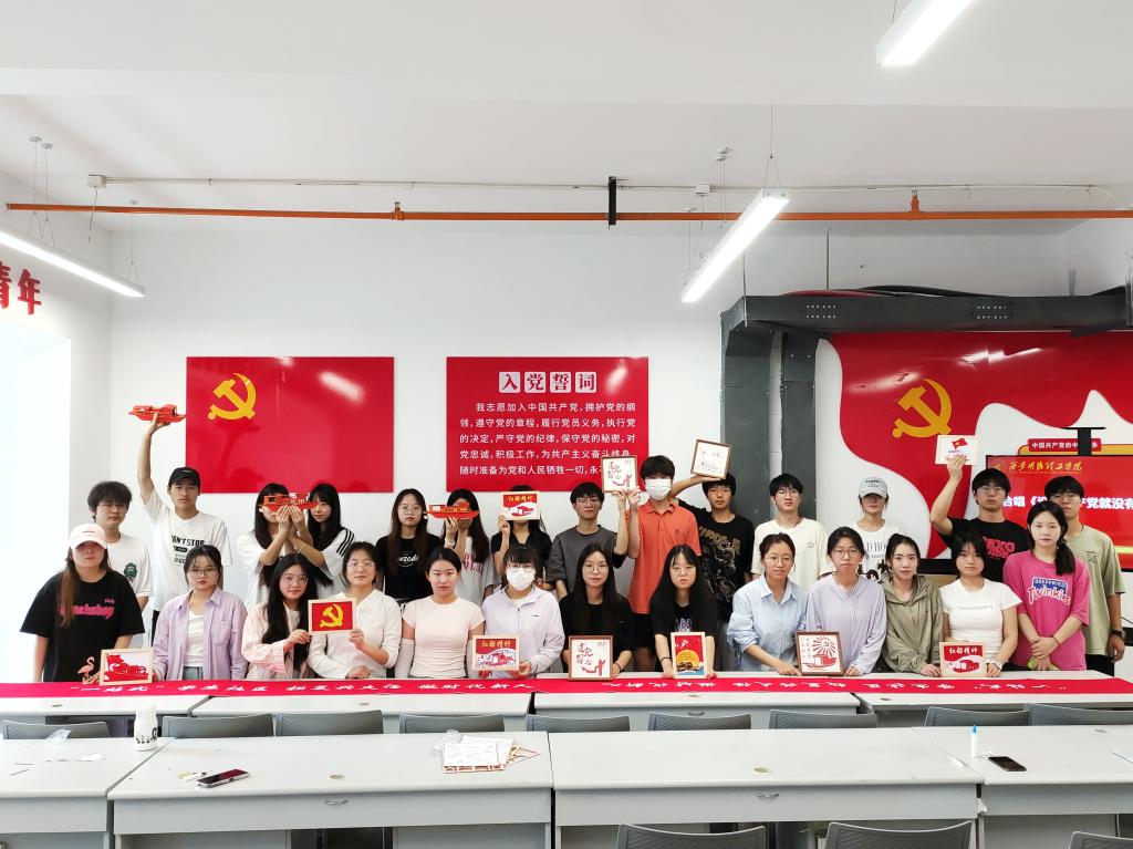 活动伊始,罗夫惠带领同学们一起奏唱国歌并重温入党誓词。随后,同学们自由组合分成6个小组,通过拼图、钻石画、非遗竹编画、五谷杂粮画、非遗纸浆画等多种形式,拼出党徽、红船,制作了我爱祖国、红船精神为主题的简笔画和纸浆画,在实践中回顾党的光辉历程,感悟伟大建党精神,表达对党的热爱之情。整个活动过程中,同学们热情高涨、团结协作、互相配合、共同完成创意作品。期间,师生们深情合唱《没有共产党就没有新中国》,唱出了对党的炽热感情,表达了对祖国的真情祝福,字字铿锵、催人振奋,展示了明德经管师生蓬勃向上的精神风貌。