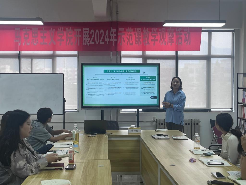 为进一步提高教师的课堂教学水平,促进教师之间的交流与学习,不断提升青年教师教学技能及思政课教育教学质量,2024年9月11日下午,马克思主义学院在明志楼306会议室开展示范课教学观摩活动。此次活动邀请西安财经大学马克思主义学院副院长任艳妮副教授作为嘉宾进行点评,活动由马克思主义学院德育教研室主任樊静主持,《思想道德与法治》课程组全体教师参会。