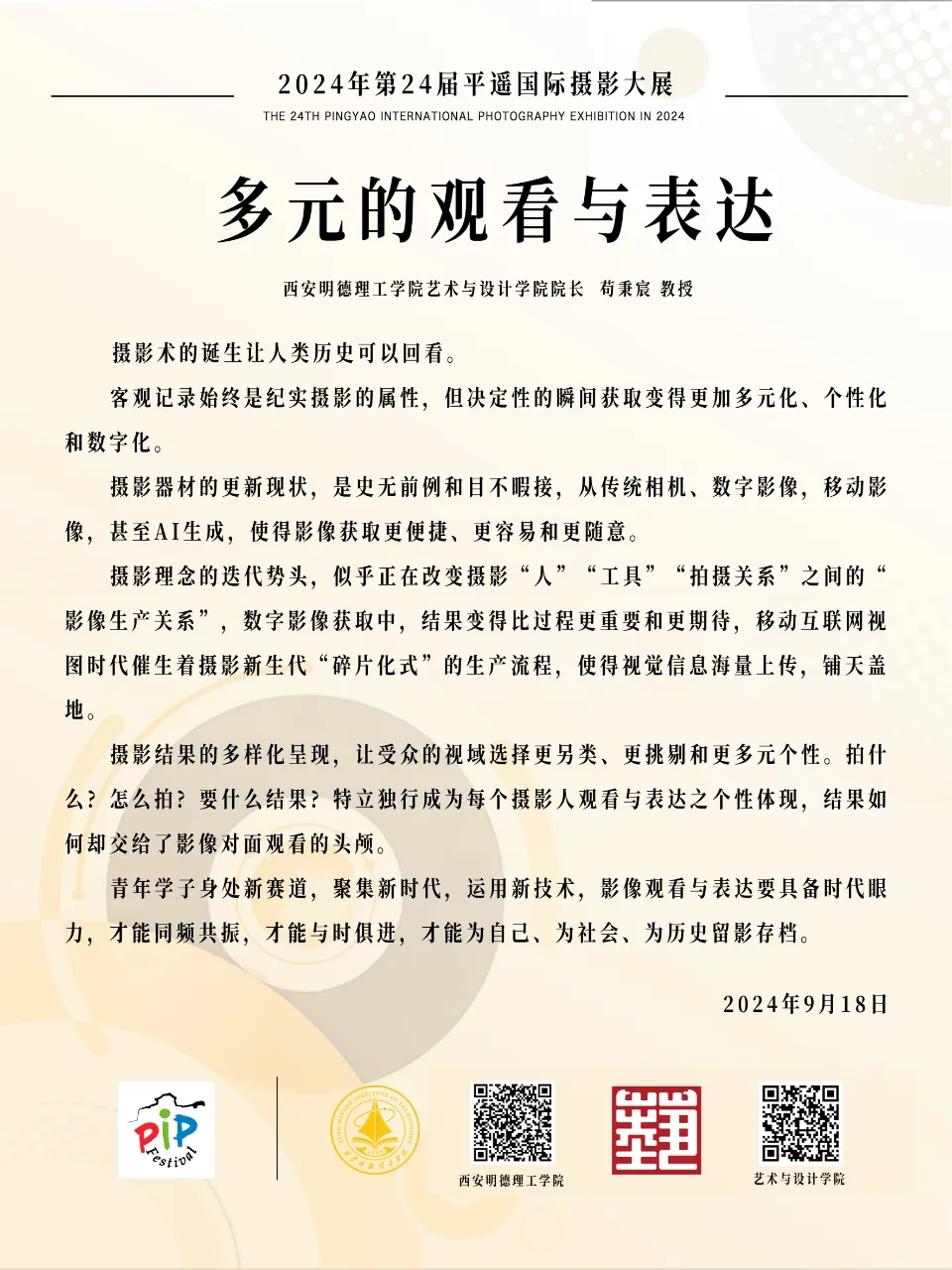 2024年9月19日,以“廿四光华•新质影像”为主题的2024第24届平遥国际摄影大展在平遥古城迎薰门广场开幕。