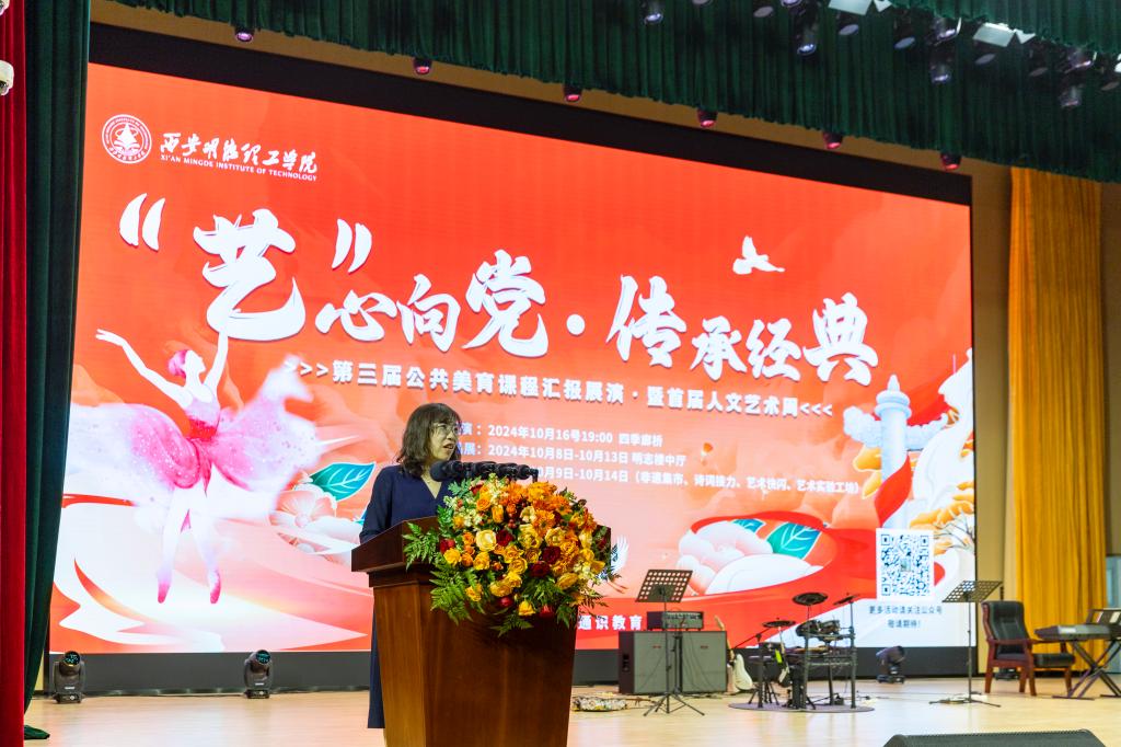 通识教育学院副院长郑薇在致辞中提出,近年来,世界杯官网公共美育课程水平和师生的艺术素养在不断提升,通识教育学院秉着为党育人、为国育才,践行初心使命,落实立德树人,扎根时代生活,遵循美育特点,弘扬中华美育精神。通过学院开设的公共美育课程、公共美育活动,让世界杯官网学生获得美的滋养。