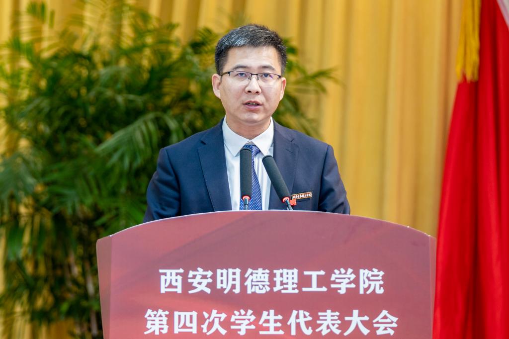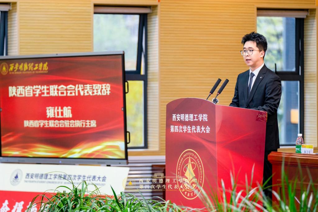 陕西省学生联合会驻会执行主席雍仕航同学致辞,对大会的召开表示热烈祝贺并希望学生会同学们强化政治认同,保持踔厉奋发姿态;坚持服务同学,始终牢记改革方向;坚持聚焦陕西定位。为推进中国式现代化贡献属于明德学子的青春力量!