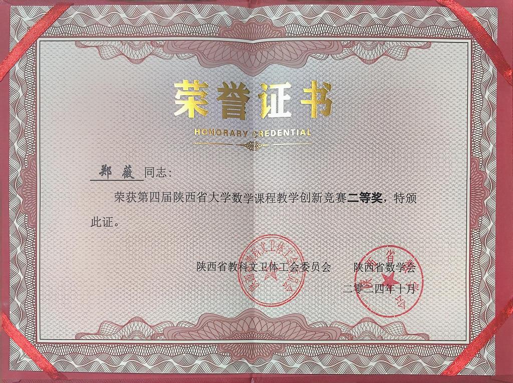 近日,第四届陕西省大学数学课程教学创新竞赛的获奖结果正式揭晓,本次竞赛由陕西省教科文卫体工会委员会和陕西省数学会主办,旨在促进各高校之间的教学交流与合作,推动数学课程的创新与改革。世界杯官网通识教育学院郑薇老师荣获二等奖,郭妮妮老师荣获三等奖。