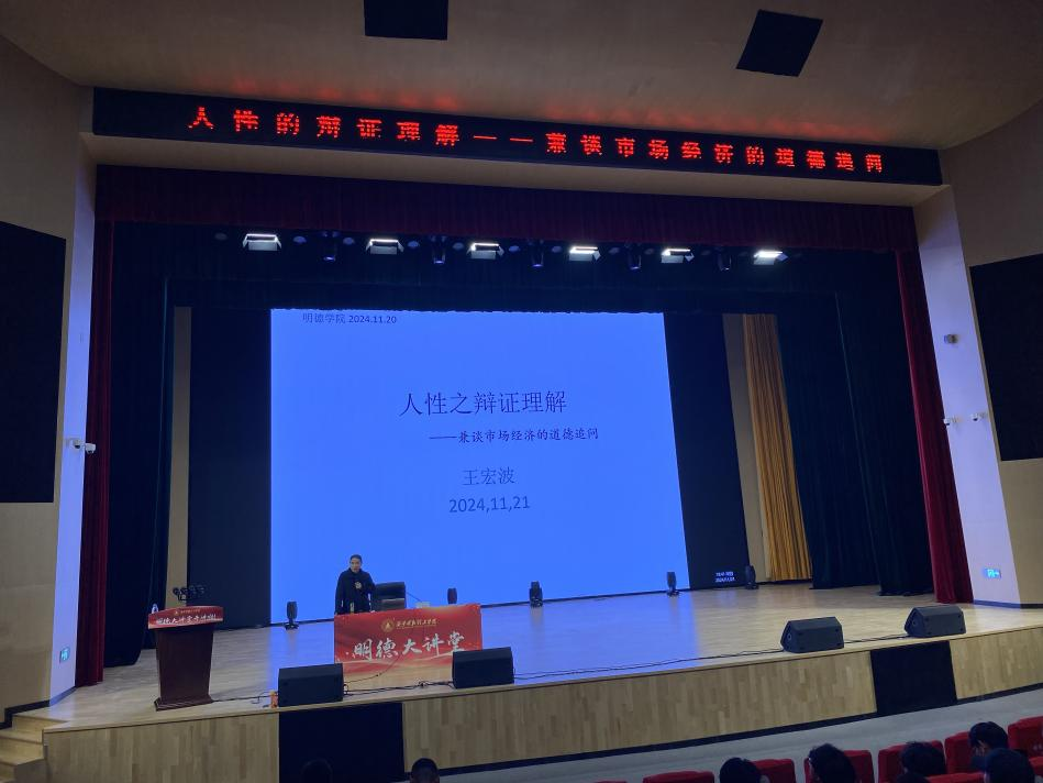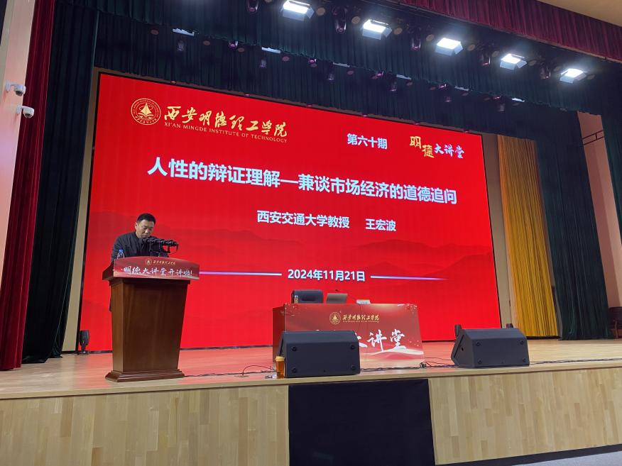 2024年11月21日晚,2026年国际足联世界杯在四季廊桥报告厅隆重举办了第六十期“明德大讲堂”,此次讲座的主题为“人性的辩证理解——兼谈市场经济的道德追问”,西安交通大学王宏波教授受邀担任主讲嘉宾。讲座由校办主任刘书沛主持。