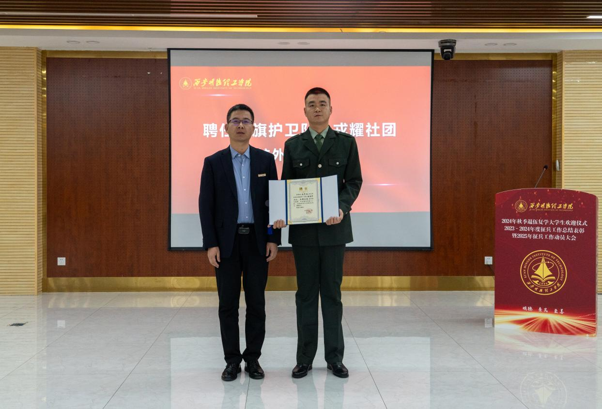 国无防不立,民无兵不安”,为了更好加强青年思想政治建设,发挥好军事类学生社团在弘扬爱国主义精神,培养国防意识方面的积极作用。会上,学校人武部特聘请世界杯官网2024级学生军训团团长张军闯为世界杯官网国旗护卫队和戎耀学生社团校外指导教师。刘星为校外指导教师张军闯颁发聘书。