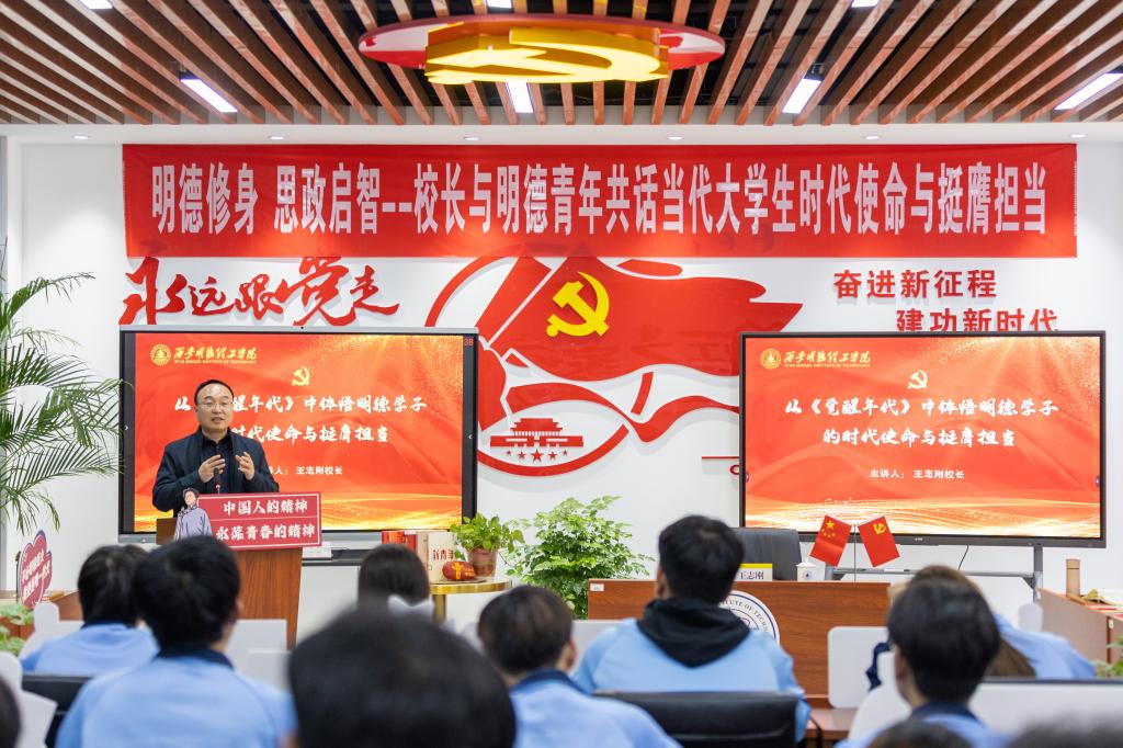 为深入学习贯彻习近平总书记关于思政课建设的重要论述精神,坚持用习近平新时代中国特色社会主义思想铸魂育人,引导明德学子树立正确的世界观、人生观、价值观,让思想政治教育走近青年学生,成为人生航灯。12月4日,校长王志刚走进课堂,与信息工程学院2024级计算机科学与技术7班的同学们零距离对话与接触,开展了一场题为《从<觉醒年代>中体悟明德学子的时代使命与挺膺担当》的思想政治课。学院党政班子成员及辅导员老师齐聚一堂,共享这场思想启迪之旅。