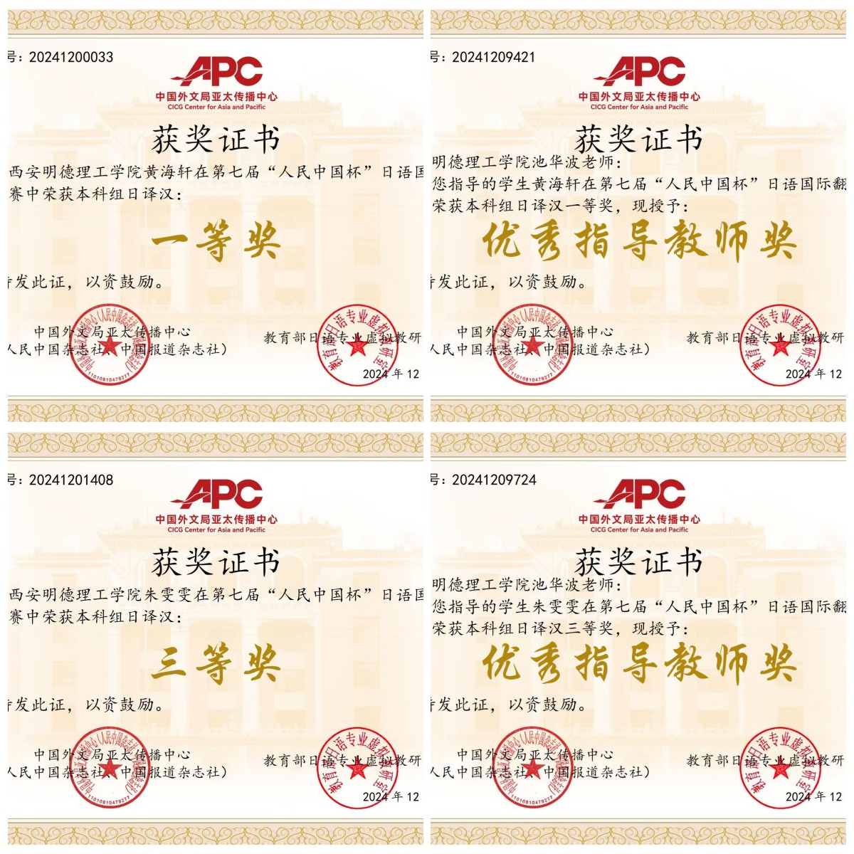 日语专业2021级黄海轩同学获得“本科组日译汉一等奖”,2021级朱雯雯同学获得“本科组日译汉三等奖”。日语专业教师池华波获得“优秀指导教师奖”。