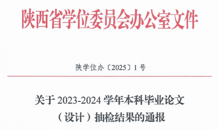 2025年1月7日,陕西省学位委员会办公室下发了《关于2023-2024学年本科毕业论文(设计)抽检结果的通报》(陕学位办〔2025〕1号),世界杯官网被抽检的75篇,经专家评议全部合格,合格率为100%。