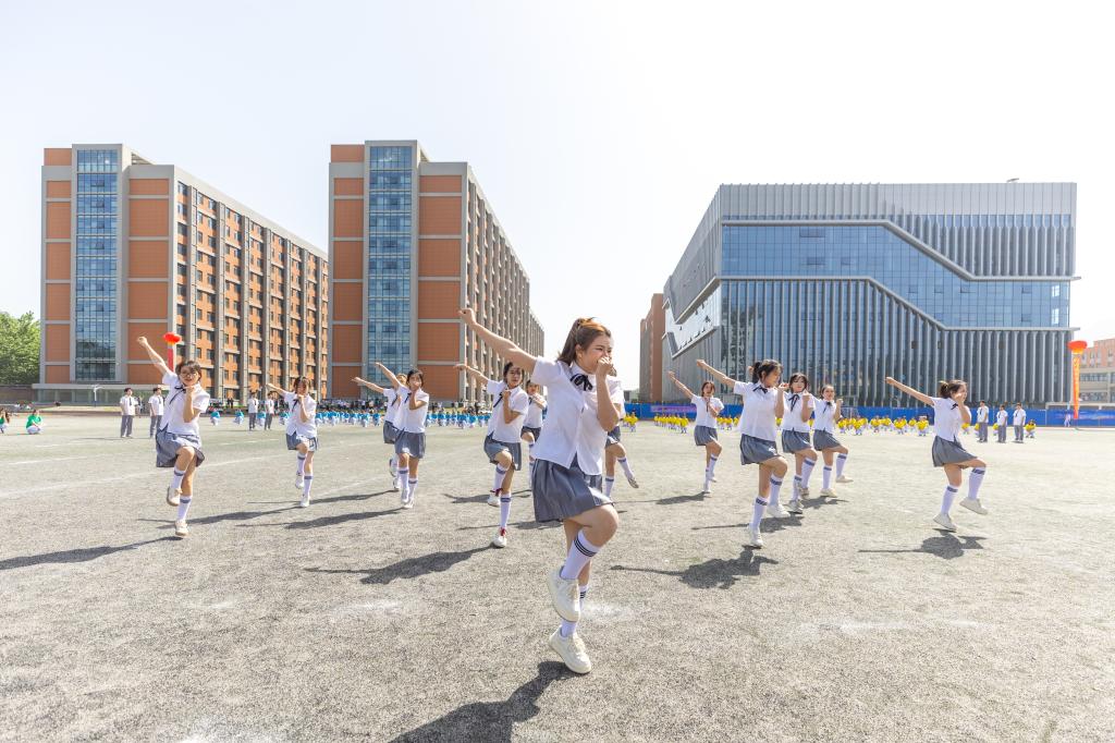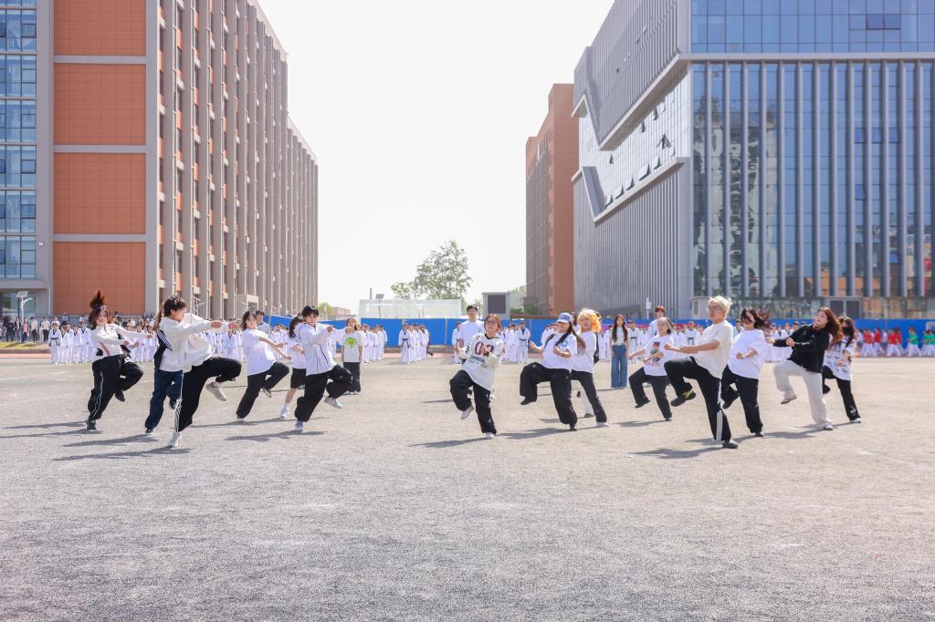 团体操《相亲相爱》及体育舞蹈今年带来了全新的视觉体验。众多学生身着多彩服装通过方阵变换呈现出层次美、动作美,舞蹈动作也融入了更多互动元素,大家的笑容更加灿烂,将明德学子团结友爱、互帮互助的精神风貌展现得更加生动形象,寓意着全校师生在这个温暖的大家庭中相亲相爱,携手共进。伴随着流行歌曲《APT》,热烈奔放的拉丁舞音乐如同一团烈火将瞬间点燃全场。学生们犹如灵动的火焰,以极具爆发力与美感的舞步,将拉丁舞的魅力展现得淋漓尽致。