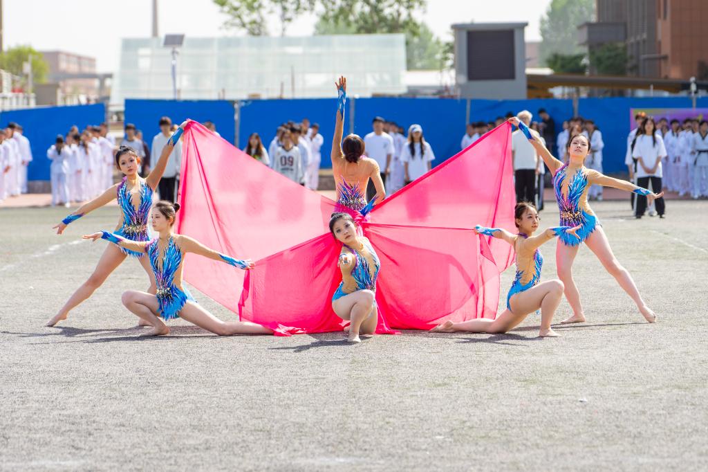 艺术体操表演《我的祖国》在婉转旋律中优雅展开。学生们手持粉色纱巾轻盈入场,纱巾如春日桃花瓣般随舞步翻飞,忽而化作“粉霞漫天”的柔美弧线,忽而舒卷成“丝路云锦”的层叠波浪。当《我和我的祖国》副歌响起,她们高举纱巾,粉色浪潮中跃动着金色阳光,以灵动的肢体语言和浪漫的色彩表达,勾勒出对祖国的脉脉深情与青春礼赞。