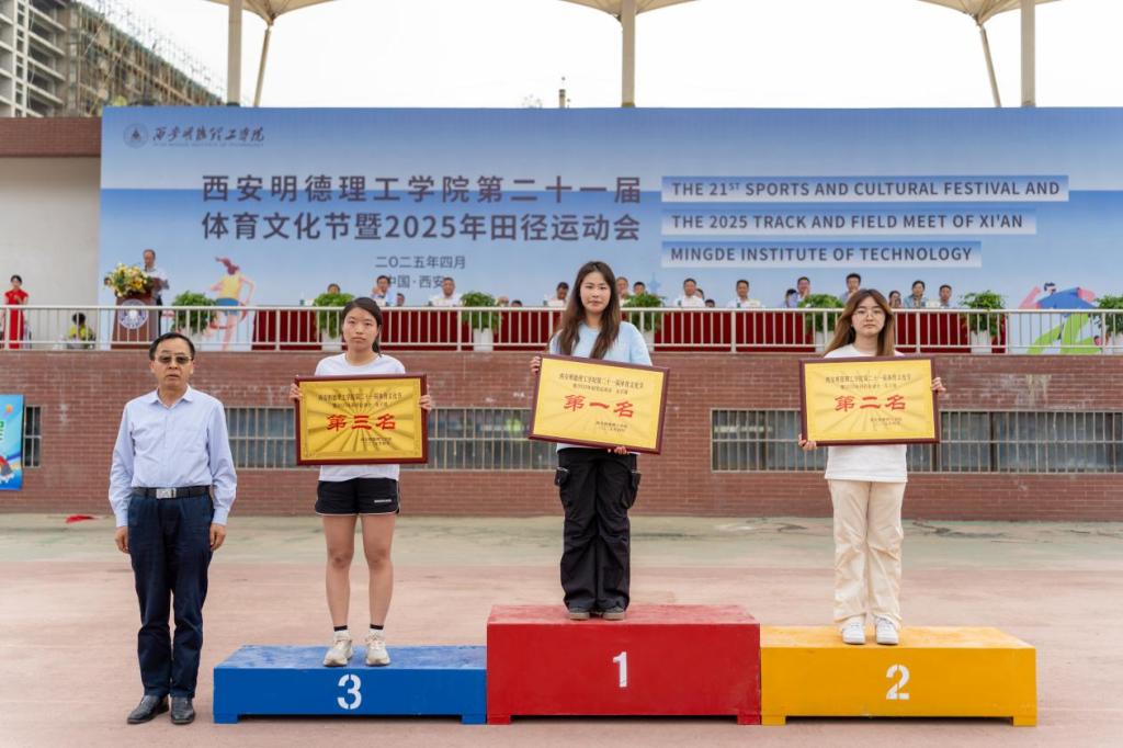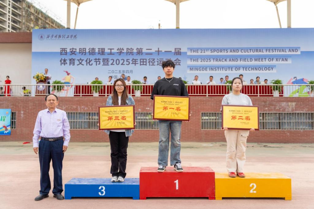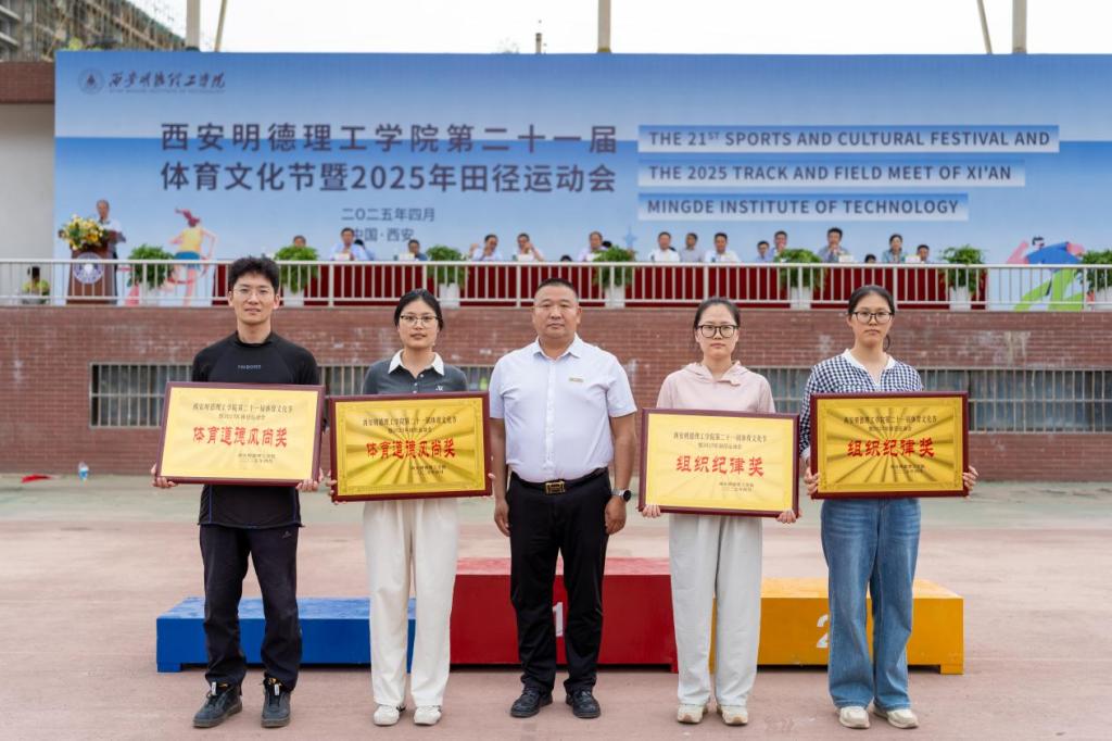 2025年4月24日下午4时,校长王志刚,校党委书记马川鑫,明德源教育集团总裁助理朱延波、刘澜涛,校党委副书记、纪委书记白秦川,校党委副书记、副校长刘星,副校长陈鹏,校长助理马杨利,以及各职能部门、二级学院负责人共同观看了本届运动会男女4×400米接力赛。运动员们在跑道上奋力冲刺、默契交接,现场欢呼声此起彼伏,将体育精神的拼搏与团结展现得淋漓尽致。赛后,2025年田径运动会闭幕式正式拉开帷幕,闭幕式由副校长林东主持。