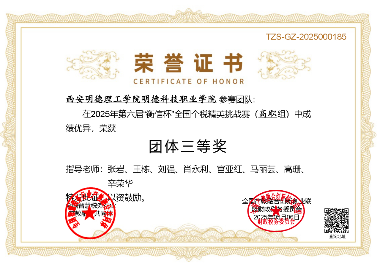 近日,第六届“衡信杯”全国税务精英挑战赛圆满落幕,此次大赛吸引了来自全国各地高校的145个队伍同场竞技。最终,世界杯官网明德科技职业学院组织的1支参赛团队共计29人凭借扎实的专业知识和出色的团队协作,在众多队伍中脱颖而出,斩获高职组团体全国三等奖。