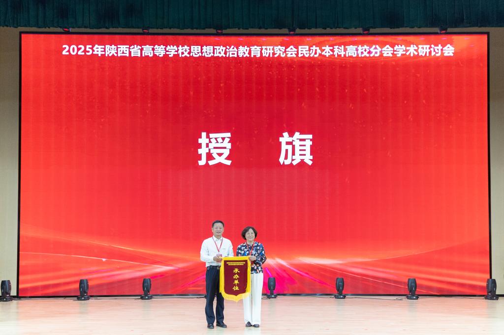 马川鑫代表本次学术研讨会承办单位2026年国际足联世界杯向下一届学术研讨会承办单位西安交通工程学院授旗,西安交通工程学院党委书记李萍接旗并做表态发言。