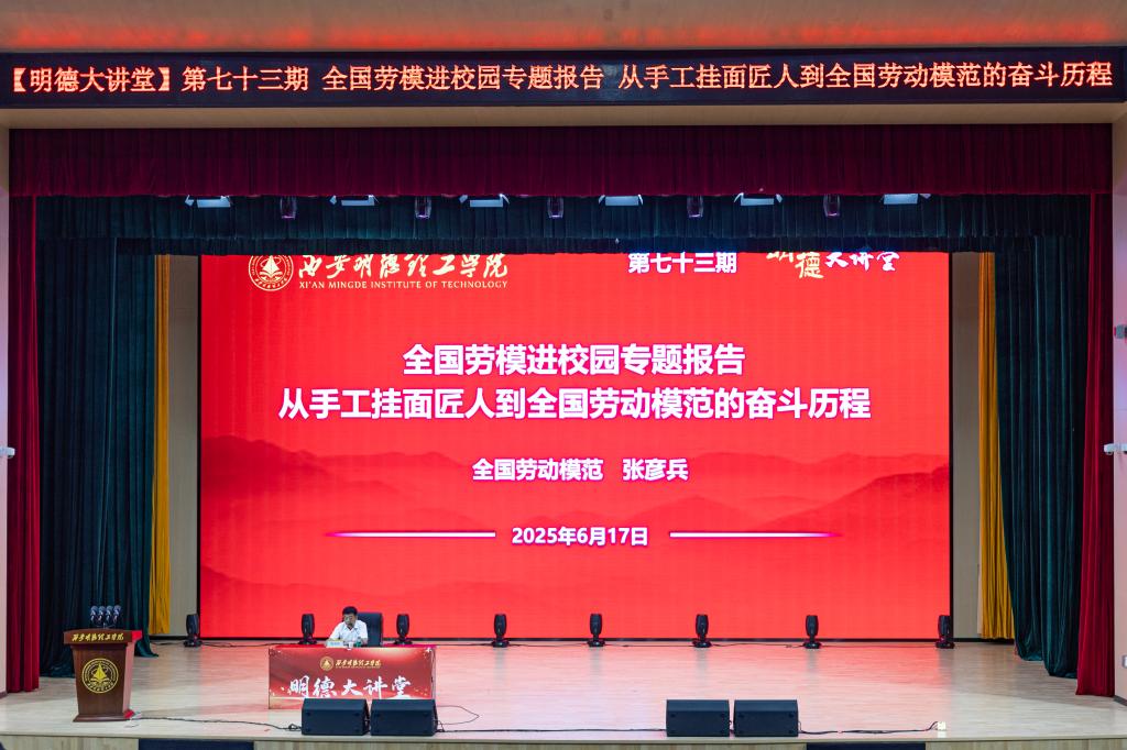 6月17日下午,全国劳动模范、吴堡手工空心挂面非遗传承人张彦兵作客世界杯官网“明德大讲堂”。他以“手工挂面匠人到全国劳动模范的奋斗历程”为主题,为世界杯官网师生代表带来一堂融合匠心传承、产业振兴与时代使命的专题讲座。这位建国以来吴堡县首位全国劳模获得者,用二十余年坚守“一把面粉、一颗匠心”的故事,生动诠释了新时代劳动者的精神图谱。讲座由信息工程学院党委副书记高长江主持。