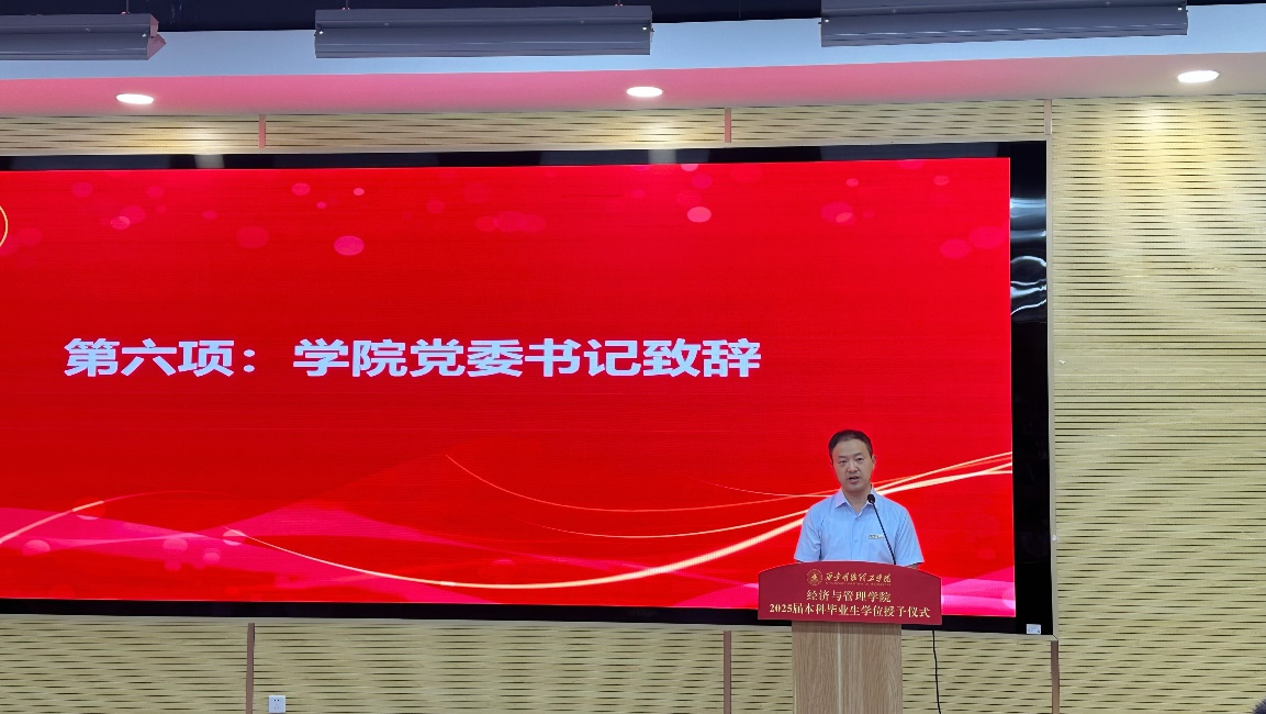 何文举代表学院进行致辞,向圆满完成学业的毕业生们表示热烈祝贺,向倾心育人的教师和无私支持的家长致以衷心感谢。他回顾了经济与管理学院近年来在专业建设、人才培养、管理服务、科学研究、产教融合等方面的成绩,分享了优秀学子的突出事迹,激励同学们向榜样学习,立大志、明大德、成大才、担大任,以青春之火,传承明德人的精神特质,到祖国和人民最需要的地方建功立业,以实际行动书写绚丽的青春华章。