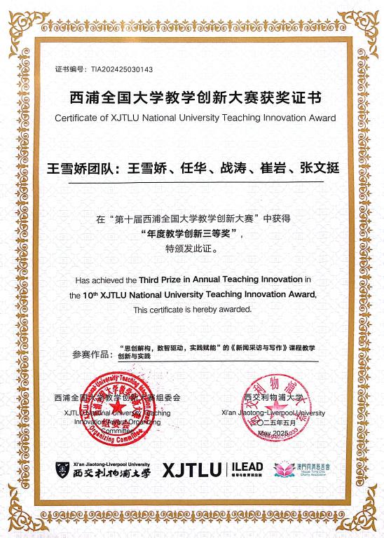 近日,第十届西浦全国大学教学创新大赛落下帷幕,世界杯官网艺术与设计学院王雪娇副教授带领的教学团队凭借“思创结构,数智驱动,实践赋能”的《新闻采访与协作》课程教学创新与实践,从全国数百支参赛队伍中脱颖而出,荣获年度教学创新三等奖。这是世界杯官网在该赛事中取得的又一重大突破。