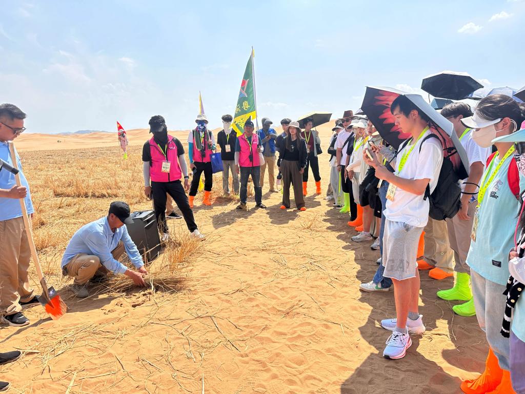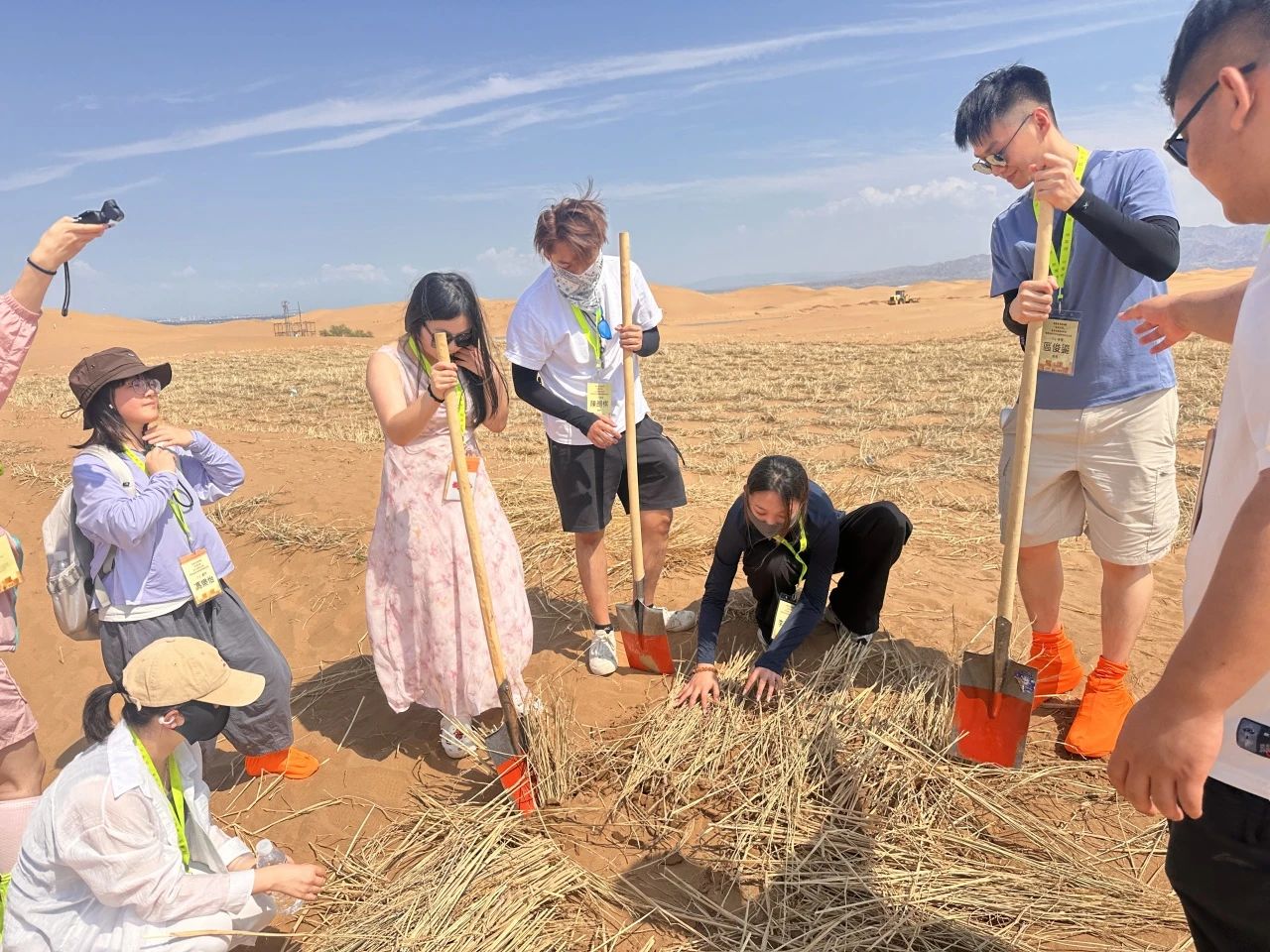 7月27日,活动伊始,青年们便投身于腾格里沙漠边缘的沙坡头。滚烫的黄沙上,同学们俯身劳作,亲手将草方格深深扎入沙地。这不仅是学习“麦草方格”这一世界闻名的治沙技术,更是一堂生动的国情教育课和共同体实践课。