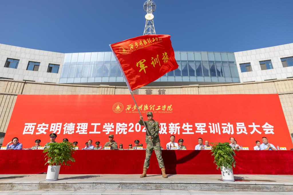 校长王志刚教授为军训旅授旅旗。旗帜飘扬,使命在肩,象征着军训旅正式肩负起新生军训国防教育的职责。