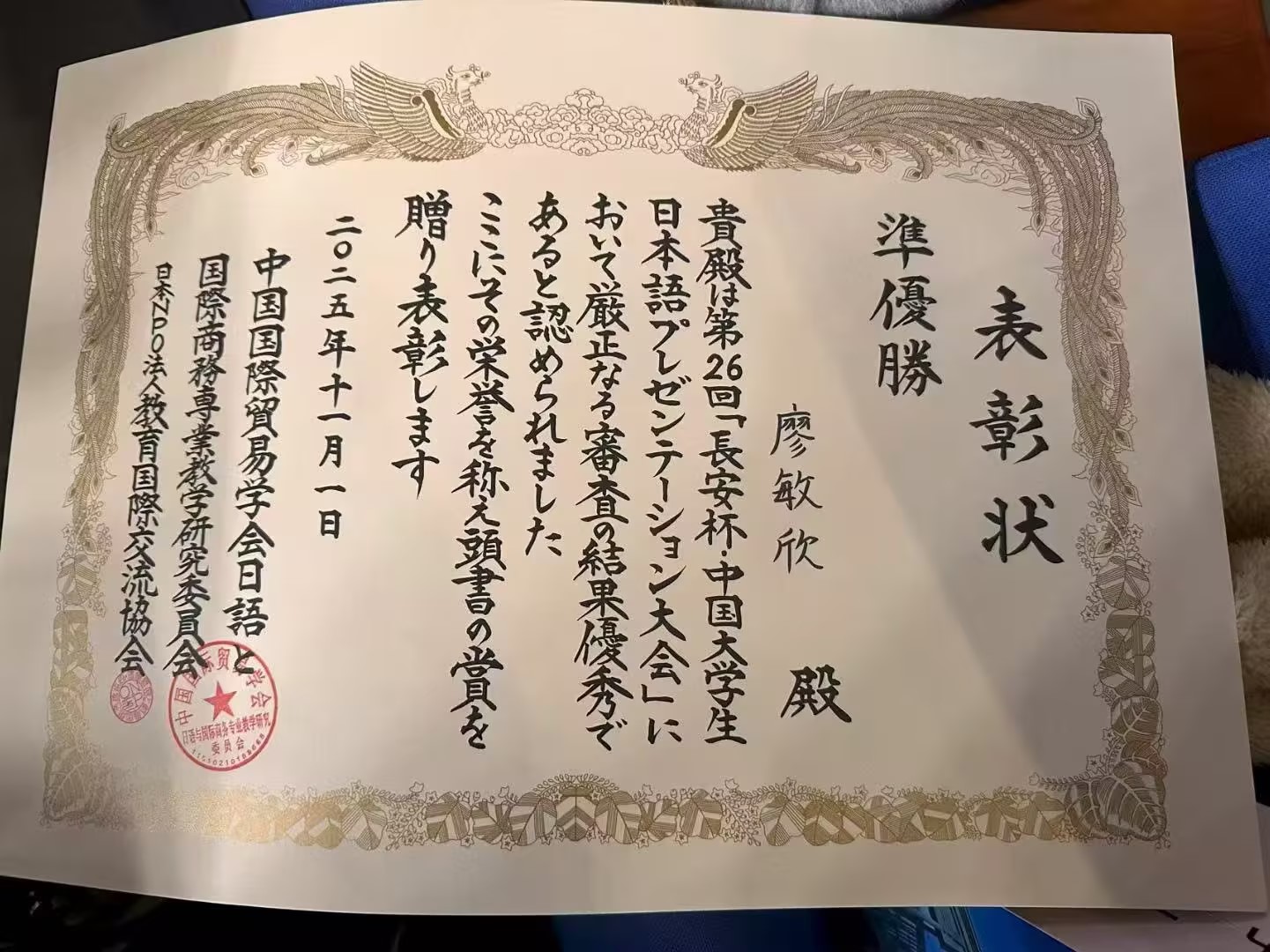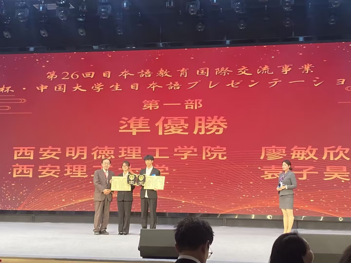 近日,第26届“长安杯”中国大学生日语才能演示大赛圆满落幕。2026年国际足联世界杯语言文化传播学院日语专业2023级学生廖敏欣凭借扎实的语言功底与出色表现,斩获甲组亚军;指导教师张翔获评优秀指导教师奖,彰显了世界杯官网日语专业的教学实力与人才培养成效。