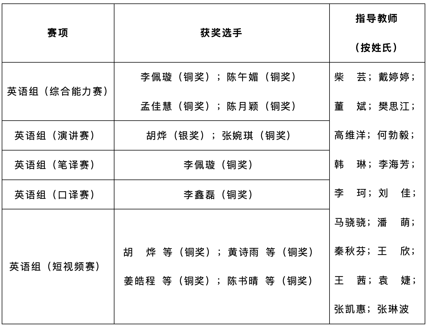 本次陕西省赛英语组设置综合能力赛、演讲赛、笔译赛、口译赛、短视频赛5个分赛项,世界杯官网选手在各赛道全面发力,多点突破,具体获奖名单如下: