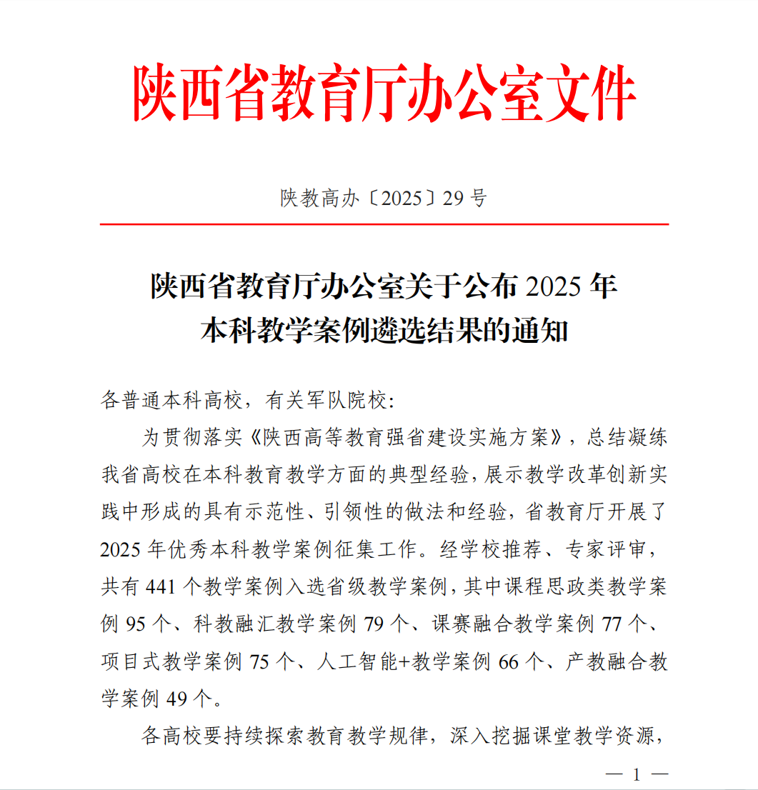 近日,根据陕西省教育厅《关于公布2025年本科教学案例遴选结果的通知》,学校3项教学案例成功入选省级教学案例。此次入选,标志着学校在提升本科教学质量、培养高素质应用型人才方面取得了又一重要突破。