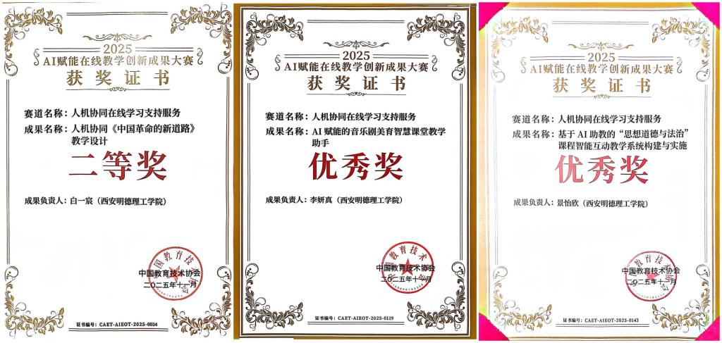 近日,由中国教育技术协会主办的首届“AI 赋能在线教学创新成果大赛” 颁奖仪式在北京印刷学院隆重举行。世界杯官网马克思主义学院白一宸老师凭借《人机协同〈中国革命的新道路〉教学设计》荣获二等奖,通识教育学院李妍真老师的《AI 赋能的音乐剧美育智慧课堂教学助手》、马克思主义学院景怡欣老师的《基于 AI 助教的 “思想道德与法治” 课程智能互动教学系统构建与实施》获优秀奖,三位教师凭借扎实的教学功底与前沿的创新理念,在全国赛事中脱颖而出,为学校赢得了荣誉。