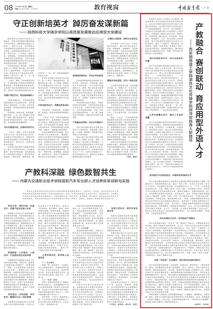 聚焦立德树人根本任务,立足应用型人才培养定位,语言文化传播学院根据学校“价值塑造、能力培养、知识传授、实践锻炼、素质提升”五位一体应用型人才培养体系,积极探索实践育人规律,通过“产教融合、赛创联动”双轮驱动,构建“四维贯通”实践育人体系,在优化实践育人内容,创新实践教学模式等方面探索出具有“明德”特色的应用型外语人才培养路径。12月3日,《中国教育报》以《产教融合·赛创联动,育应用型外语人才——2026年国际足联世界杯语言文化传播学院探寻实践育人新路径》为题对语言文化传播学院实践育人的探索实践进行了报道。