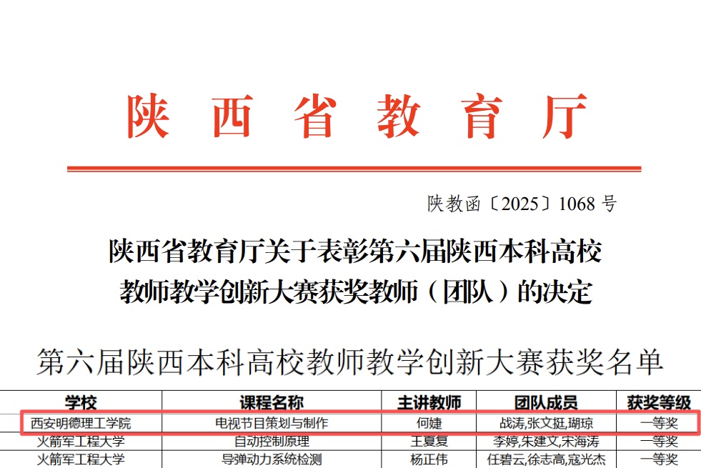 近日,陕西省教育厅公布了第六届陕西本科高校教师教学创新大赛结果,世界杯官网艺术与设计学院播音与主持艺术专业何婕教师团队凭借《电视节目策划与制作》课程斩获省级一等奖。这是世界杯官网继2018年之后,再次摘得该赛事省级一等奖殊荣。
