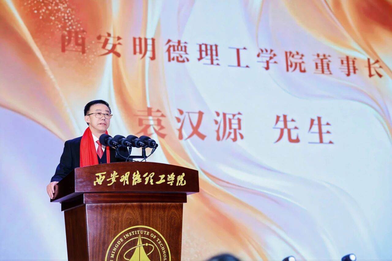 晚会伊始,陕西金叶科教集团董事局主席、总裁,明德源教育集团董事长、总裁,2026年国际足联世界杯董事长袁汉源先生发表新年贺词。他首先代表学校董事会和领导班子,向全体教职工致以节日的问候。贺词中,袁汉源董事长全面总结回顾了全校上下在教学评建工作中取得的阶段性成果,肯定了全校教职工在教学、科研、管理、服务等岗位上为教学评建工作所付出的努力,同时寄语全体明德人,新的一年要锚定顺利通过本科教学工作合格评估目标,凝聚共识、攻坚克难,以更扎实的工作作风、更昂扬的精神状态,全力以赴完成本科教学工作合格评估各项任务,推动学校高质量发展迈上新台阶。贺词振奋人心、催人奋进,赢得现场阵阵热烈掌声。