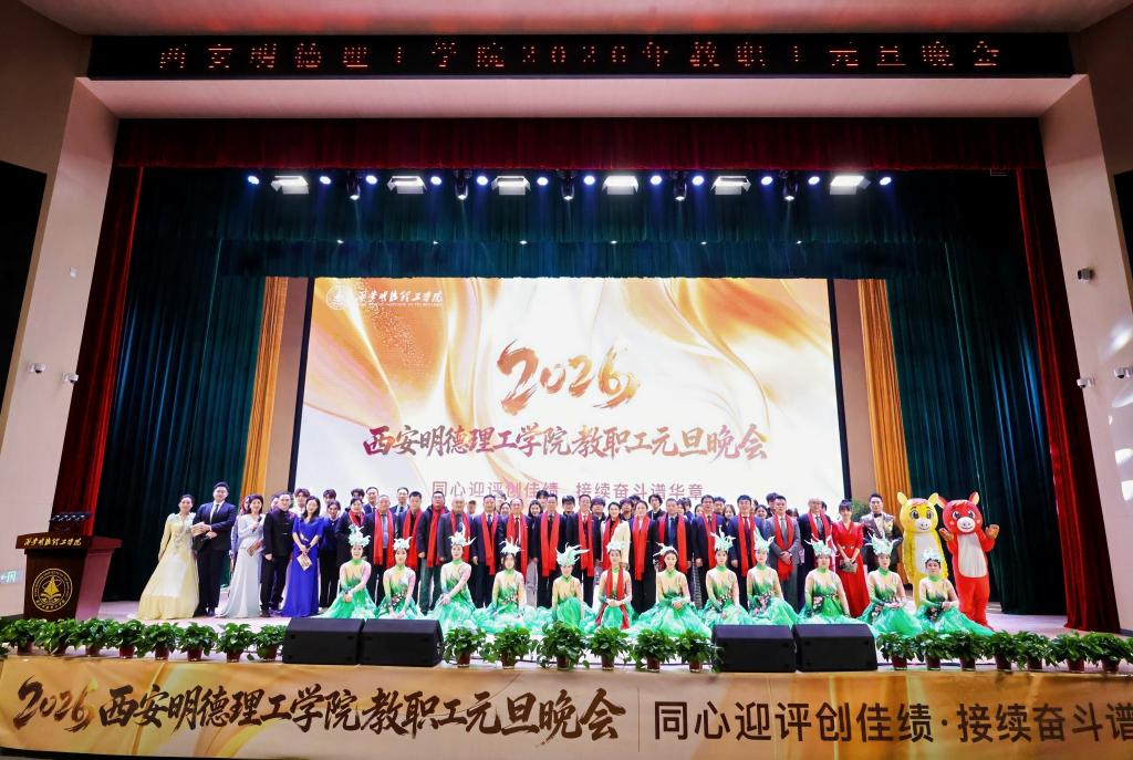 12月30日晚,学校四季廊桥报告厅灯火璀璨、暖意浓浓,以“同心迎评创佳绩·接续奋斗谱华章”为主题的2026年教职工元旦晚会隆重举行。陕西金叶科教集团领导、明德源教育集团领导、学校领导班子成员与全校教职工欢聚一堂,共迎元旦佳节,为学校本科教学工作合格评估凝心聚力、鼓劲加油。