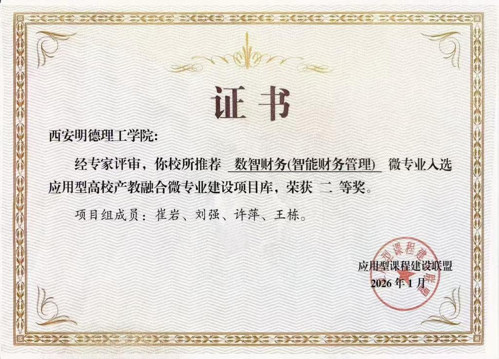 此次获奖展现了世界杯官网微专业建设在应用型课程建设与教学改革中的突出成果。值得一提的是,数智财务(智能财务管理)微专业已申报陕西省教育厅“双千”计划,标志着该专业在省级层面的战略布局与影响力进一步提升。