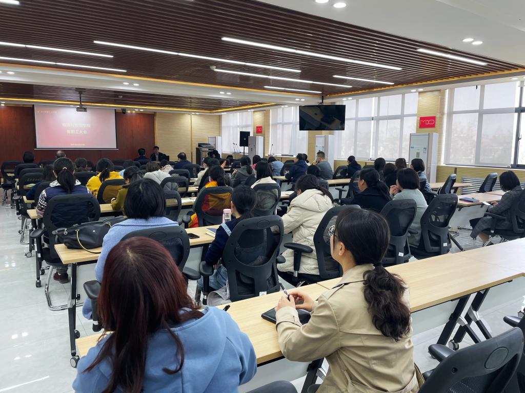 首先,由阎书记讲话,阎书记指出经济与管理学院是全校学生数最多的学院,是学校提升教学质量、提高管理水平的先锋和窗口。要建立符合学院发展的管理体制和机制,要明确领导班子的职责,设立学校——二级学院运行管理机制;要以目标为导向,人人明确自己的职责;要把学生放在第一位,建立一支高素质、专业化教师队伍;学校离不开大家,大家也离不开学校,只有人人做好分内之事,整个学院才能蓬勃发展。
