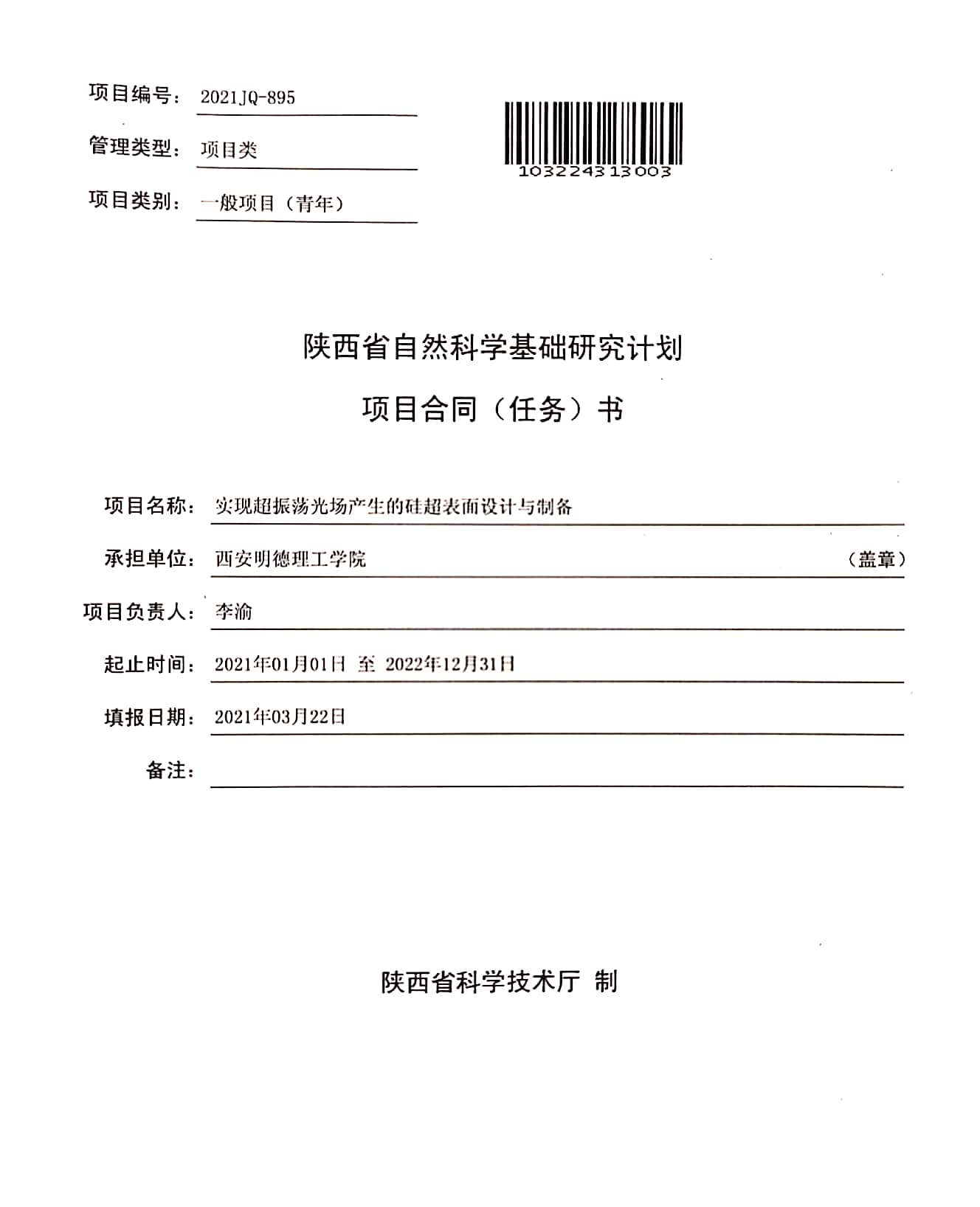 近日,世界杯官网李渝老师主持的《实现超振荡光场产生的硅超表面设计与制备》项目经过网上申报,专家评审等环节,已获批2021年度陕西省自然科学基础研究计划项目立项,项目类别为一般项目(青年)类,项目编号为2021JQ-895。