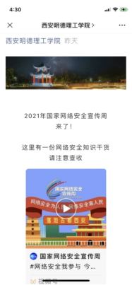 ——线上线下营造网络安全宣传氛围。围绕“网络安全为人民,网络安全靠人民”主题,在学校官网发布国家“网络安全宣传周”专题网站,同时通过官方微博、微信及抖音推送网络安全相关内容;学校主要楼宇张贴网络安全宣传海报、放置展架,营造网络安全周宣传氛围。