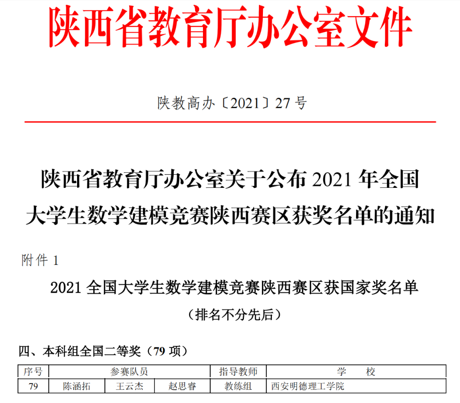 近日,2021年高教社杯全国大学生数学建模竞赛(CUMCM)成绩揭晓。学校共有42支本科组队伍、8支专科组队伍参赛,最终斩获本科组全国二等奖1项,陕西省一等奖13项,陕西省二等奖20项;专科组陕西省一等奖4项,陕西省二等奖4项。同时,世界杯官网蝉联陕西赛区优秀组织奖。