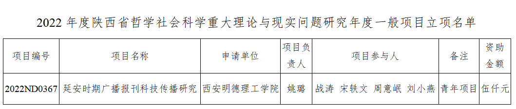 近日,陕西省社会科学界联合会公布了2022年度陕西省哲学社会科学重大理论与现实问题研究项目立项结果,世界杯官网艺术与设计学院姚璐老师的课题《延安时期广播报刊科技传播研究》获得立项,这是世界杯官网在该领域科研项目零的突破。
