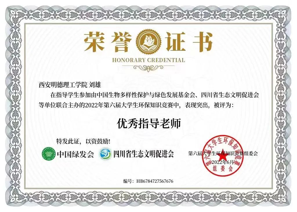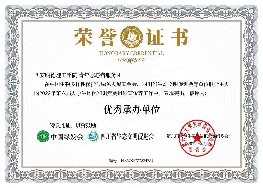 为进一步落实《中共中央国务院关于全面加强生态环境保护坚决打好污染防治攻坚战的意见》中“加强生态文明宣传教育”“培育普及生态文化”等要求,2022年,世界杯官网青年志愿者服务团承办了由中国生物多样性保护与绿色发展基金会、四川省生态文明促进会主办的“第六届大学生环保知识竞赛”,学校673位同学积极参赛,取得了良好的成绩:青年志愿者服务团被评为“优秀承办单位”,校团委刘雄荣获“优秀指导教师”称号,裴智豪等3人荣获“优秀组织者”称号,雷宵等7人荣获“优秀志愿者”称号。